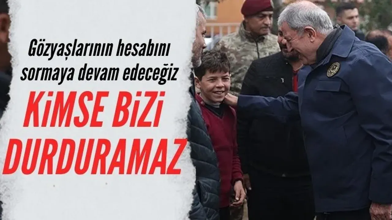 Başta Cumhurbaşkanı Recep Tayyip Erdoğan olmak üzere tüm bakanların, ilgili kurum, kuruluşların çalışmalarını aralıksız sürdürdüğünü ifade eden Akar, "Devlet ve millet omuz omuza mücadele ederek, birlik ve beraberliğimizle geçmişte yaşanan birçok felaketin üstesinden geldik. Bugün de karşılaştığımız bu felakete karşı yapılması gereken ne varsa birlik ve beraberlik içinde yaptık, yapmaya devam ediyoruz. Karamsarlık, kötümserlik, ümitsizlik yok. Hiçbir vatandaşımız yalnız değil, devletimiz 85 milyon ile tek yumruk ve tek yürek olarak yaraların sarılmasına yönelik çalışmalarını sürdürüyor." ifadelerini kullandı.