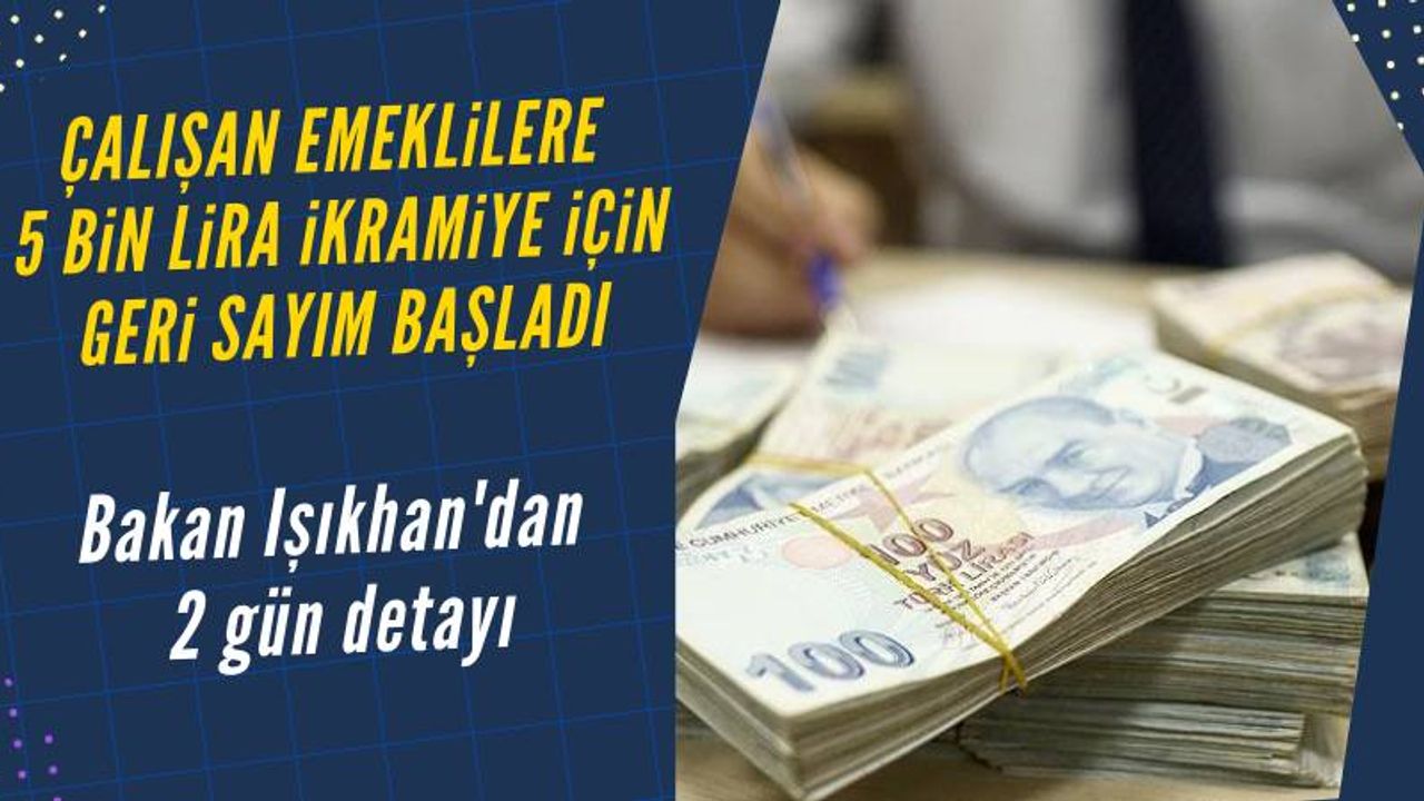 Çalışan emeklilere yönelik verilecek 5 bin liralık ikramiyeye yönelik çalışmaların tamamlandığını söyleyen Işıkhan, "Çalışan emeklilerimize 5 bin lira verilmesine ilişkin kanun teklifi Meclis'te kabul edilip Resmi Gazete'de yayımlandıktan sonra ödemeleri iki gün içinde yapacak şekilde çalışmalarımızı tamamladık. Yeni yılda emekli aylıklarının iyileştirilmesi yönünde çalışmalarımızı sürdüreceğiz" dedi.