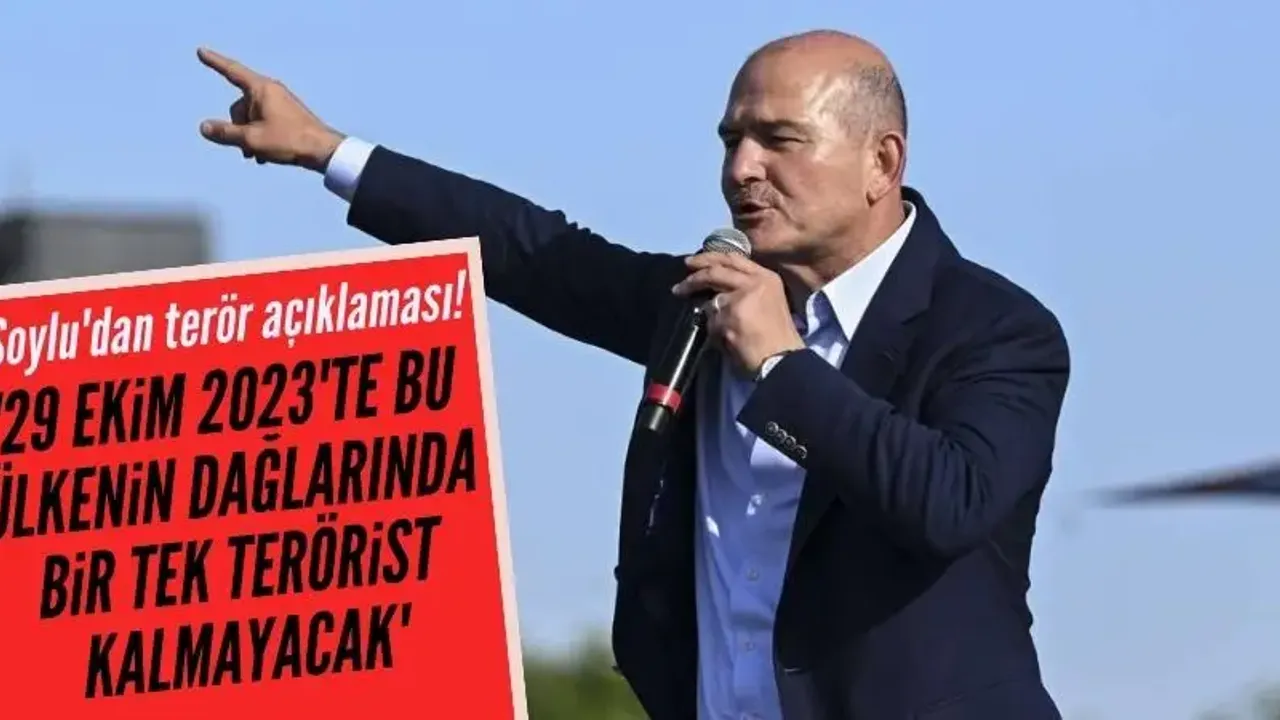 Cumhuriyet'in 100. yılında yurt içinde terörist kalmayacağını söyleyen Soylu, "29 Ekim 2023'te, Cumhurbaşkanımız Erdoğan'ın liderliğinde bu ülkenin dağlarında bir tek terörist kalmayacak. Sadece o değil, önümüzdeki 5 yıl içerisinde orayı kendi çöplüğü olarak değerlendiren ne bir Amerikan askeri bırakacağız ne bir PYD'li bırakacağız ne de bir PKK'lı bırakacağız. Çevremizdeki o coğrafyanın huzurunu ve güvenini Allah'ın izniyle dünya lideri Recep Tayyip Erdoğan sağlayacak." dedi.