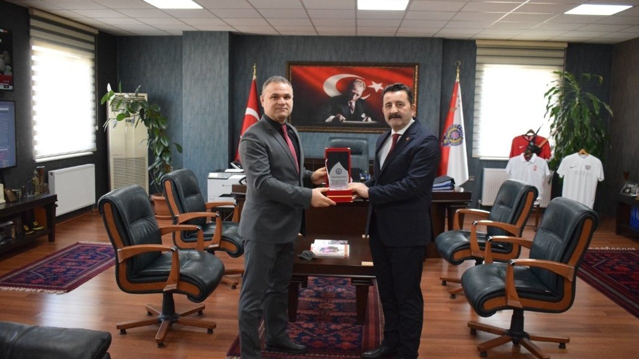 Balıkesir İl Emniyet Müdürü Hasan Onar, Polis Başmüfettişi Savaş Kaya'ya başarılı çalışmalarından dolayı teşekkür etti ve kendisine plaket takdim etti.