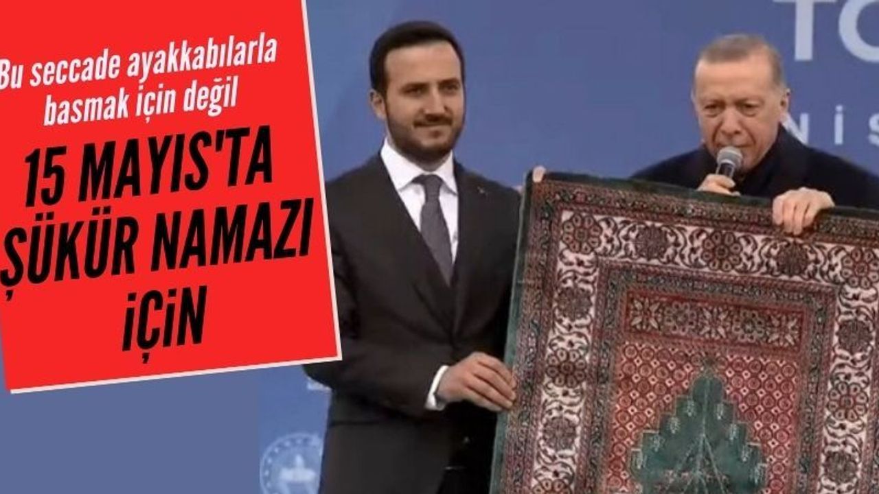 Hediyesini meydanda toplanan binlerce kişiye gösteren Cumhurbaşkanı Erdoğan, “Bu seccade ayakkabılarla basmak için değil. 15 Mayıs’ta inşallah şükür namazını bu seccadede kılabiliriz.” dedi.