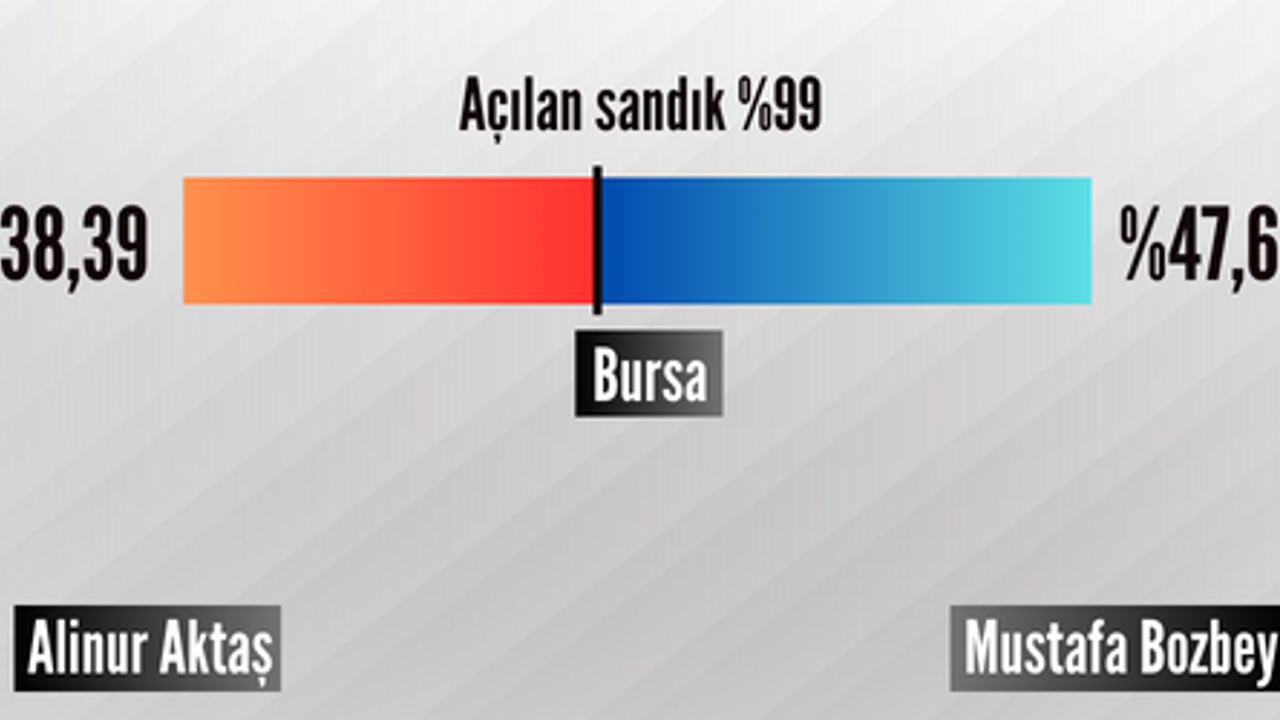 Yaklaşık 61 milyon seçmen 5 yıl boyunca görev yapacak yerel yöneticilerini belirlemek için oylarını kullandı. Sandıkların kapanmasıyla Bursa yerel seçim sonuçları belli olmaya başlıyor. Bursa'da başkanlık koltuğu için Cumhur İttifakı'nın adayı ile Alinur Aktaş ile CHP'nin adayı Mustafa Bozbey yarışıyor.