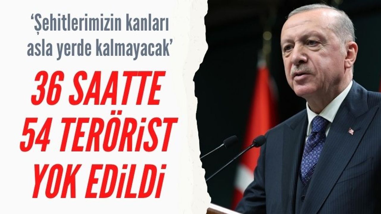 "Türkiye'nin şahlanışına set çekmeyi amaçlayan menfur terim saldırılarının kutlu yürüyüşümüzü asla durduramayacağının bilinmesini istiyorum. 12 evladımız şehit oldu. Allah rahmet etsin. Tüm ailelerine ve milletimize baş sağlığı diliyorum. Ama bakın 36 saatte 54 terörist yok edildi. Çünkü bizim bu şehitlerimizin asla kanları yerde kalmayacak. Biz biliyoruz ki şüheda fışkıracak toprağı sıksan şüheda, canı cananı bütün varlığımı alsın da hüda etmesin tek vatanımdan beni dünyada cüda."