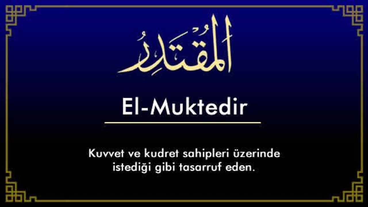 el-Muktedir: Varlık üzerinde dilediği gibi tasarruf eder, kudret sahibidir, her şeye gücü yetendir. Kuvvet ve kudret sahibi olan mutlak güç sahibi olan demektir.