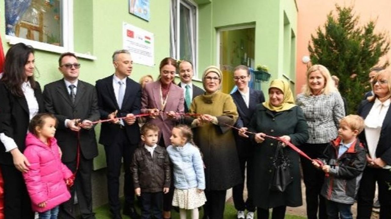 Macaristan ziyaretinde Cumhurbaşkanı Erdoğan'a eşlik eden Emine Erdoğan, Budapeşte'de Türk İşbirliği ve Koordinasyon Ajansı Başkanlığı (TİKA) tarafından donanım desteği verilen Kispet Gökkuşağı Anaokulu'nu ziyaret etti.