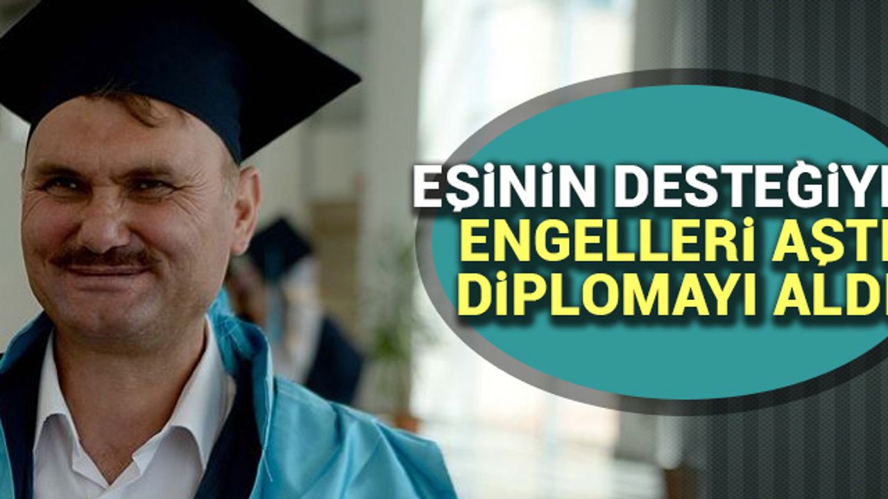 Kilis'te yaşayan 50 yaşındaki görme engelli Mahmut Açıkel, 5 yıl boyunca her gün kendisini sınıfına kadar götüren eşinin de desteğiyle, Kilis 7 Aralık Üniversitesi (KİYÜ) İlahiyat Fakültesinden mezun olmanın mutluluğunu yaşıyor.