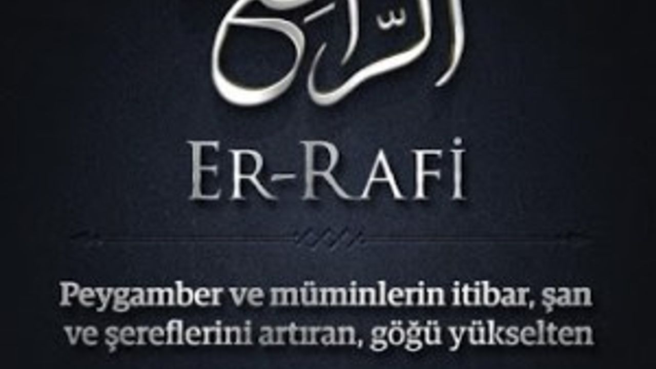 Er-Rafi; Dilediğini yükselten, kıymetlendiren, dereceler ve şeref verip yükselten, dilediğinin makam ve mertebelerini arttıran, dostlarını yücelten; dilediğini aziz kılan.
