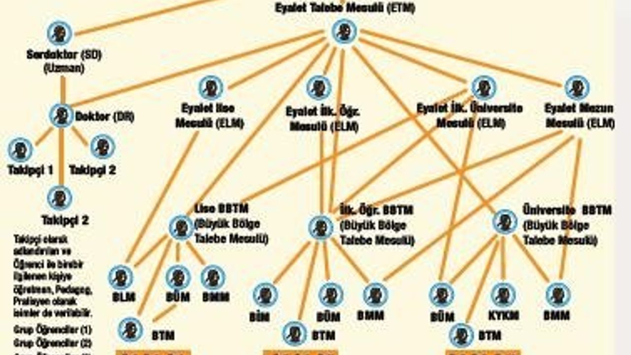 Şemayla ilgili diğer detaylar şu şekilde: Eğitim Danışmanları'nın altında Eyalet Talebe Mesulleri (ETM) bulunuyor. Eyalet Lise Mesulleri (ELM), Eyalet İlköğretim Mesulleri(EİM), Eyalet Üniversite Mesulleri (EÜM) ve Eyalet Mezun Mesulleri (EMM) sadece Eyalet Talebe Mesulleri'ne bağlı faaliyet yürütüyor. 4 ayrı koldan oluşan söz konusu mesullerin altlarında ise Büyük Bölge Talebe Mesulleri (BBTM) yer alıyor. Onların altında da Bölge Lise-Üniversite-Mezun Mesulleri bulunuyor. En alt sırada da FETÖ'nün Bölge Mesulleri'ne bağlı olan talebe evleri var. Okullara yerleştirilecek olan öğrencilerin takibini yapan Eyalet İlköğretim Mesulleri'ne örgüt içinde "Bahçevan" deniliyor. Eyalet Talebe Mesulleri öğrencilerin okul faaliyetlerini takip ediyor. İş yerlerine yerleştirilecek mezunlardan sorumlu Eyalet Mezun Mesulleri evlilik sorumlusu olarak da biliniyor.