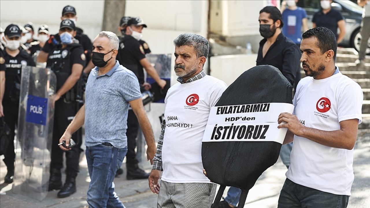 Çocukları terör örgütü tarafından dağa kaçırılan Celil Bektaş ve Süleyman Aydın, HDP Genel Merkezi'ne, "Evlatlarımızı HDP'den istiyoruz" yazılı çelenk bıraktı, ardından gazetecilere açıklama yaptı.
