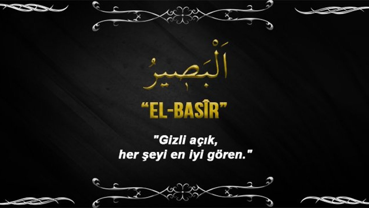El-Basîr – اَلـْـبَصِيرُ : Gizli açık, her şeyi görür, üm her şeyi kusursuzca gören, aydınlık-karanlık, yakın-uzak, küçük-büyük, her şeyi en ince ayrıntısına kadar çok iyi gören, gizli açık her şeyi çok iyi gören, bilen, bütün her şeyi gören demektir.