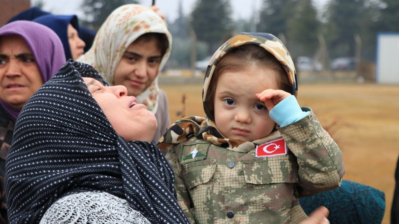 Şehidin eşi Berna Deprem, kucağına aldığı 2 yaşındaki oğlu Yağız Efe ile birlikte eşinin Türk bayrağına sarılı tabutunu öperek gözyaşı döktü.