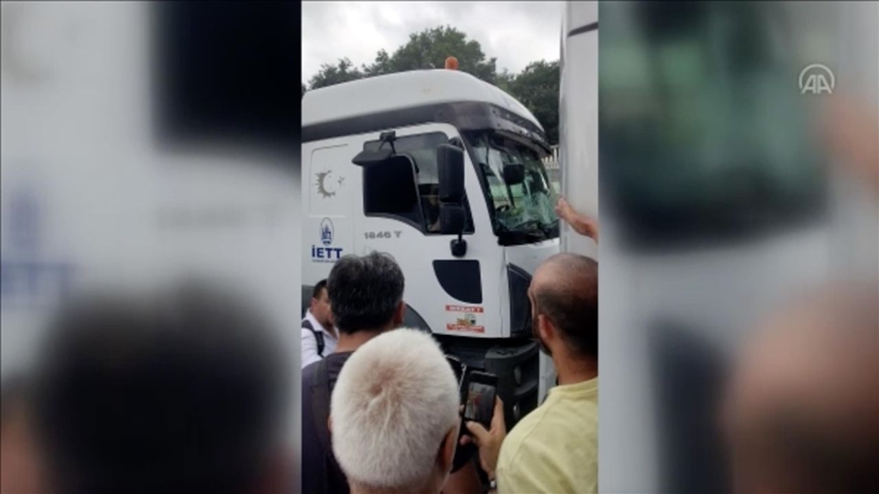 Kazanın ardından metrobüsten inen yolcular, yol bakım aracının sürücüsüne tepki gösterdi.
