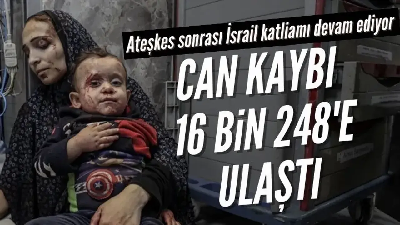 Ölü sayısının bugün 349 arttığına işaret eden açıklamada, "İsrail'in Gazze Şeridi'ne yönelik saldırısında şehit sayısı 7 bin 112'si çocuk, 4 bin 885'i kadın olmak üzere 16 bin 248'e yükselirken, kayıp kişi sayısı da 7 bin 600'e ulaştı." ifadeleri yer aldı.