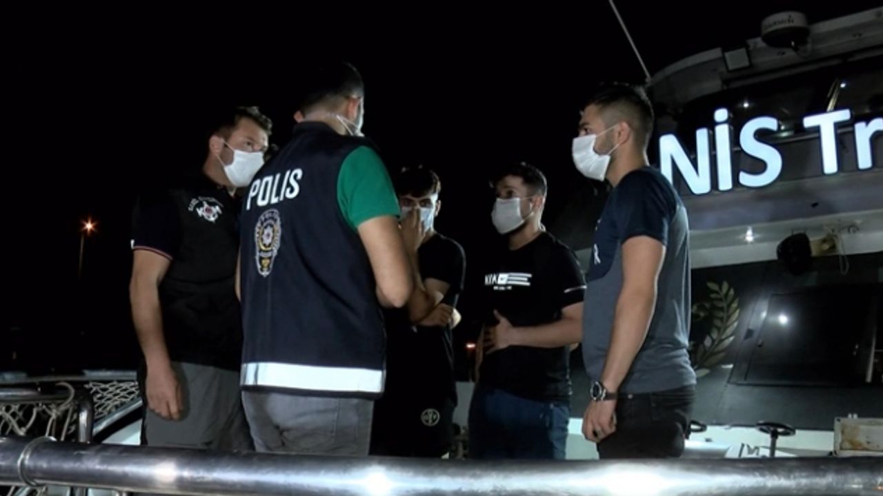 Çeşitli eğlencelerin yapıldığı teknelere çıkan ekipler, teknede bulunanların koronavirüs tedbirlerine uyup uymadıklarını kontrol etti.