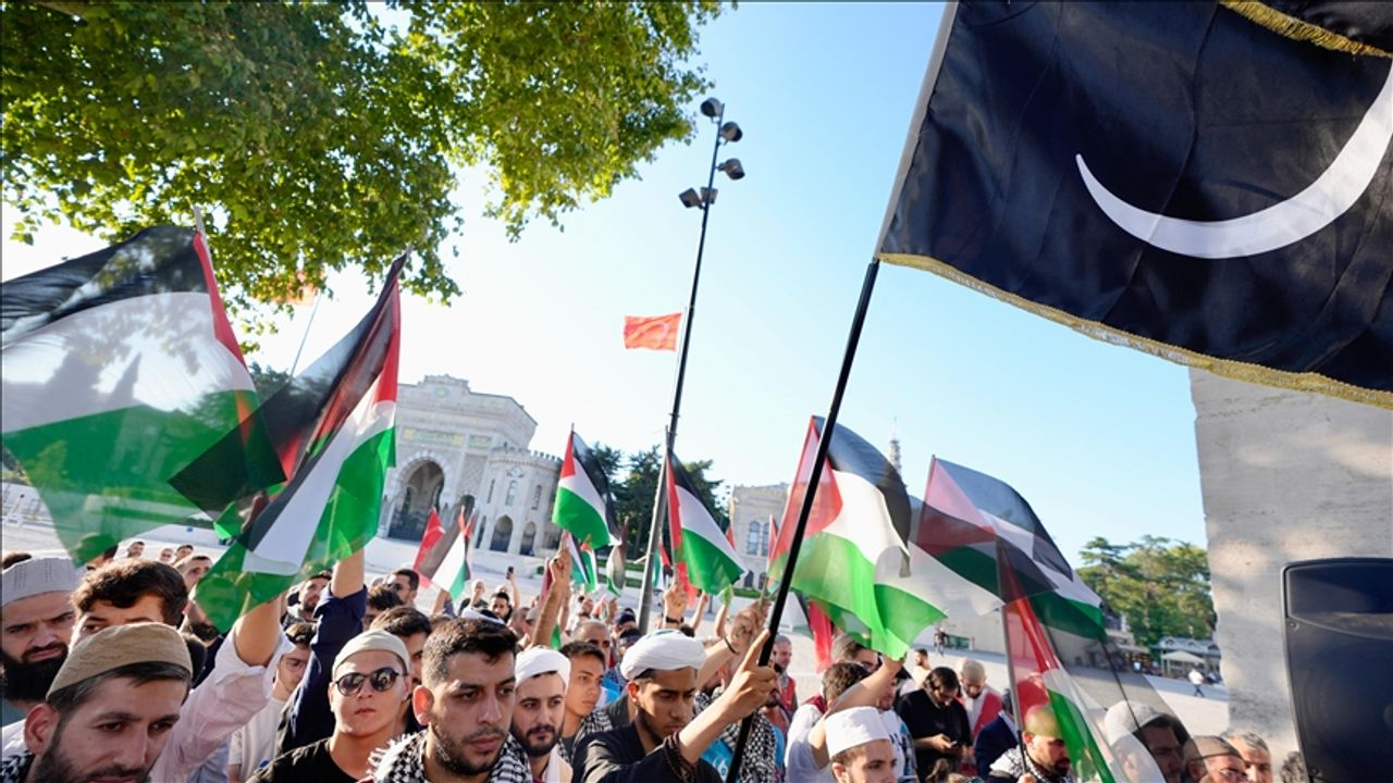 Döviz ve pankartlarla Beyazıt Meydanı'nda toplanan grup, İsrail'in Filistin'e saldırılarını protesto etti.