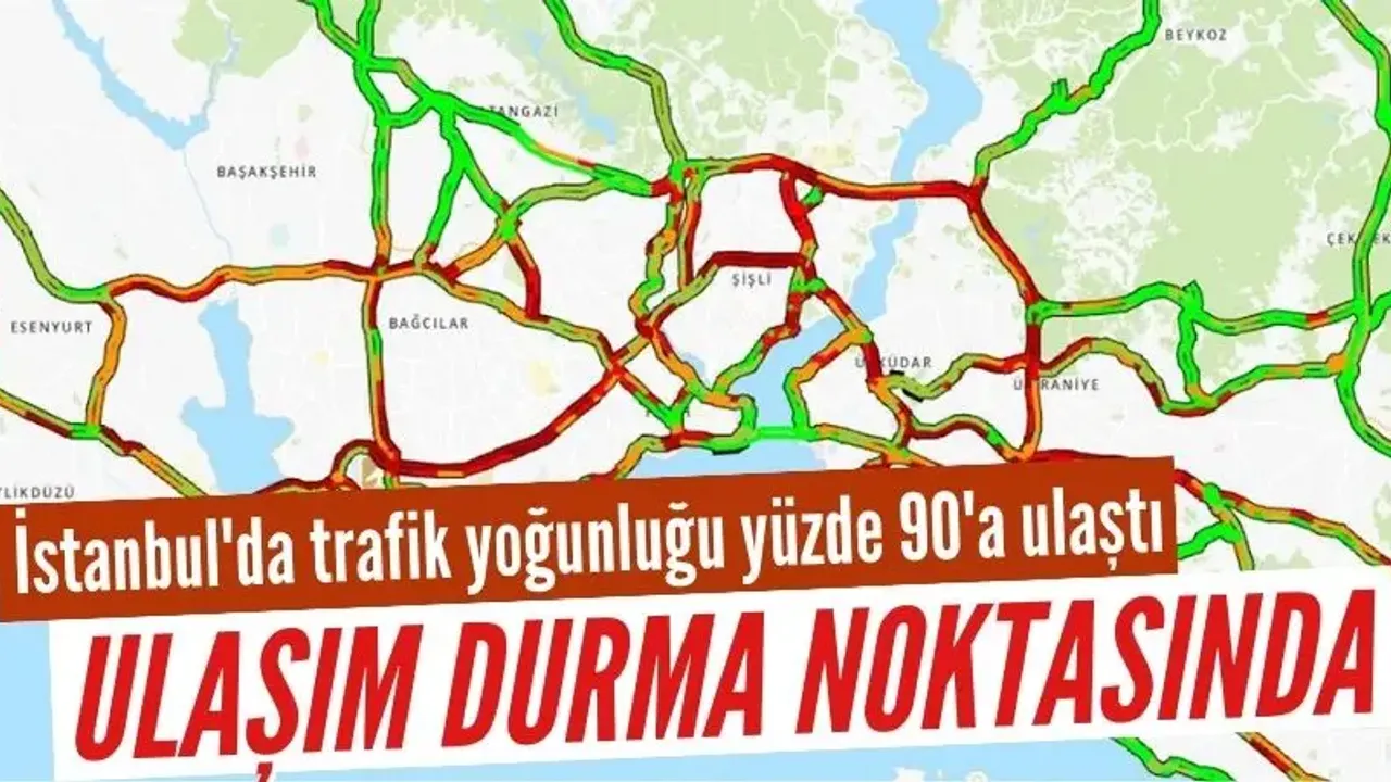 İstanbul Büyükşehir Belediyesinin mobil uygulaması İBB CepTrafik verilerine göre, trafik yoğunluğu 17.30 itibarıyla yüzde 90 olarak ölçüldü.