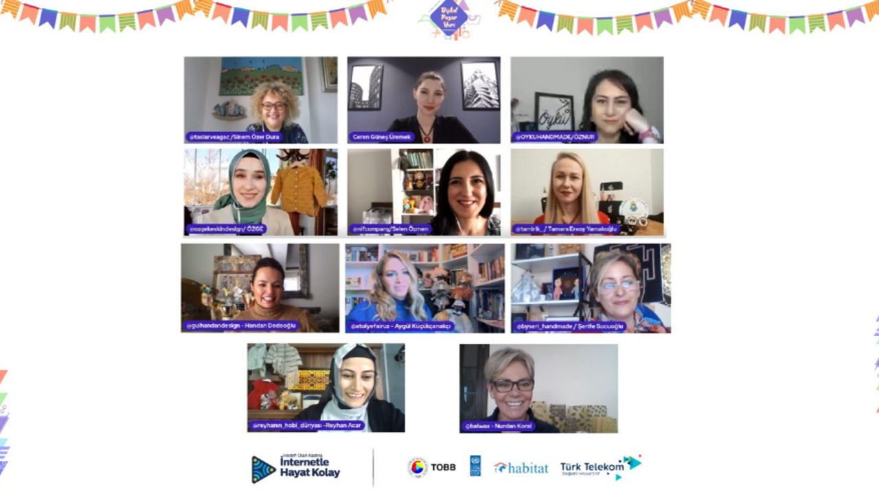 Türk Telekom’un Türkiye Odalar ve Borsalar Birliği (TOBB), Birleşmiş Milletler Kalkınma Programı (UNDP) ve Habitat Derneği iş birliğiyle hayata geçirdiği “Hedefi Olan Kadına İnternetle Hayat Kolay” projesi doğrultusunda, 8 Mart Dünya Kadınlar Günü kapsamında ‘Dijital Pazar Yeri’ etkinliği düzenlendi. Çevrimiçi düzenlenen etkinliğe, kariyer hedeflerini değiştirerek kurumsal hayata veda edip kendi ürünleriyle markalarını yaratan kadınlar ile daha önce hiç çalışmamış ancak el emeği ürünlerini internetten kitlelere ulaştıran 10 kadın katıldı.