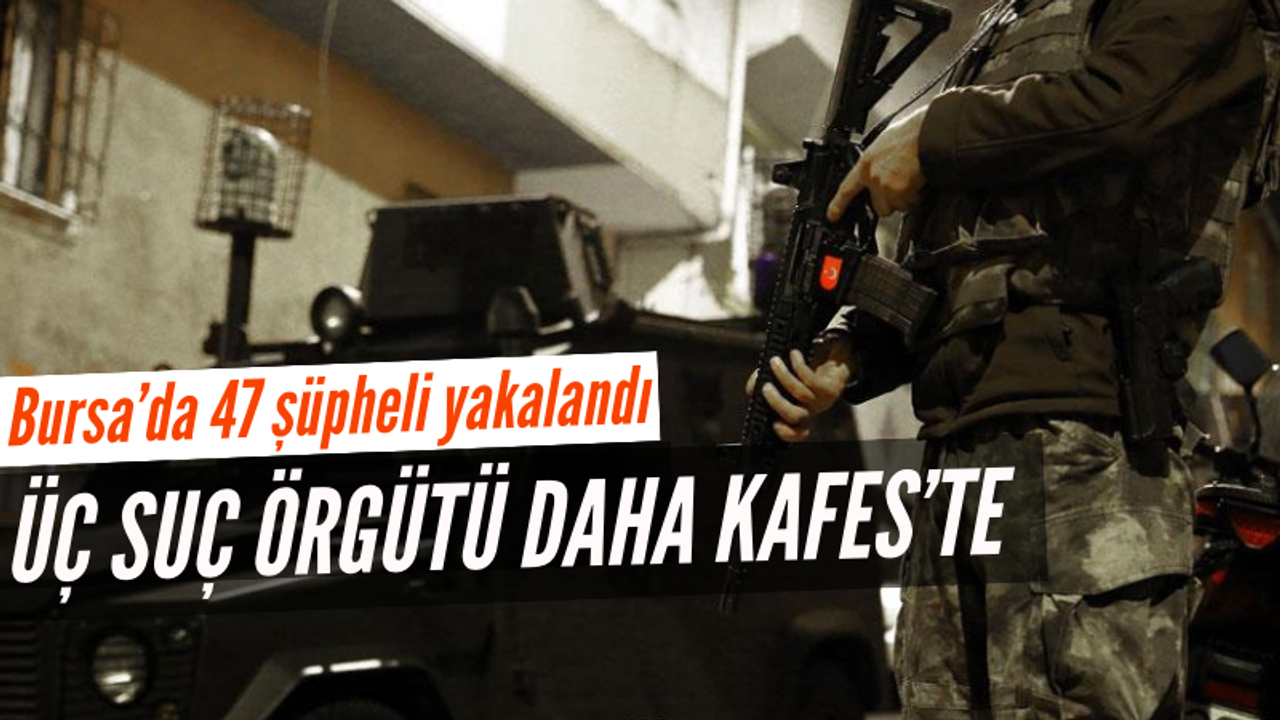 Yerlikaya, sosyal medya hesabından yaptığı açıklamada, Bursa'da Bülent Çetkin, Osman Deliçay ve Muhammet Tayyar Türkeş'in elebaşılığını yaptığı 3 ayrı organize suç örgütünün çökertildiğini, operasyonlarda örgüt elebaşlarının da aralarında bulunduğu 47 şüphelinin yakalandığını belirtti.