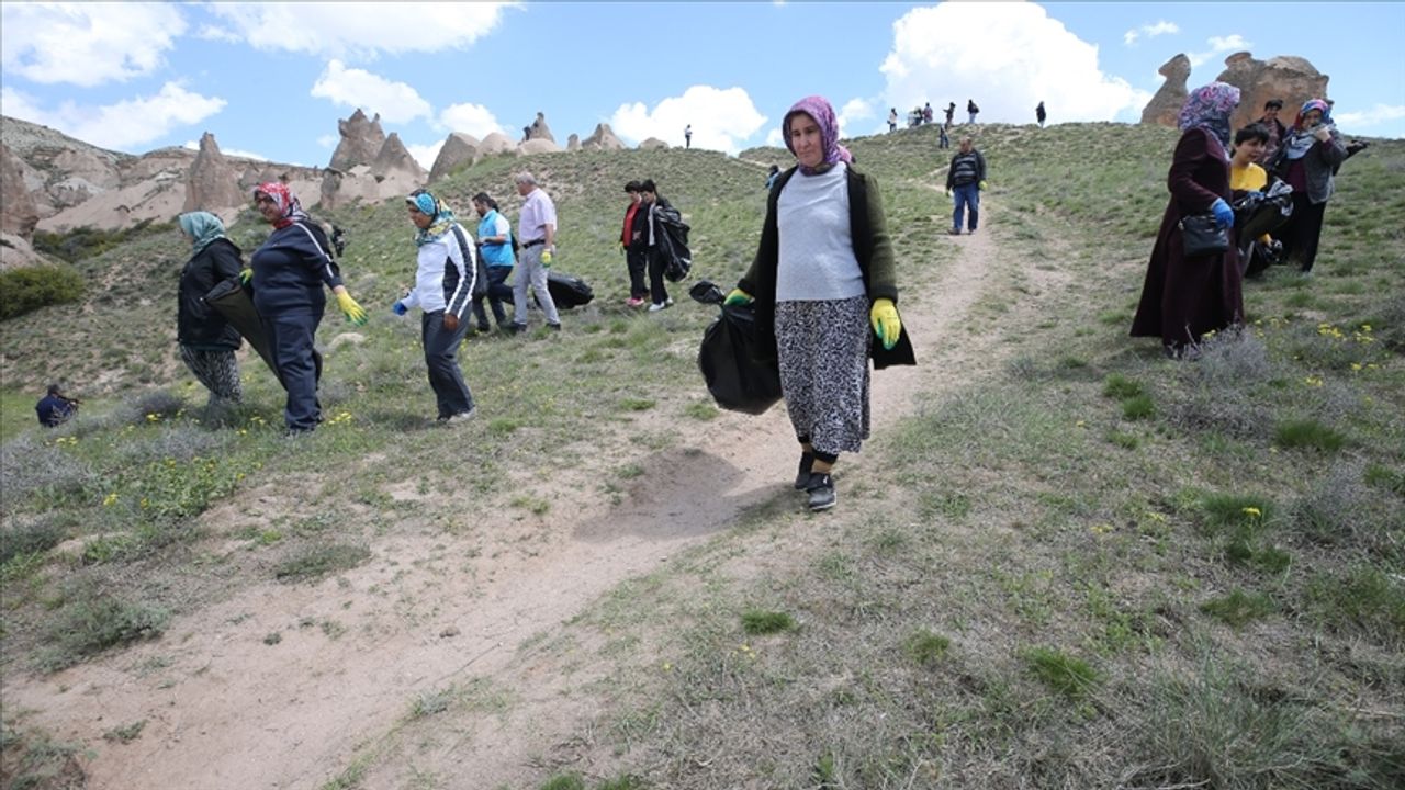 Otobüsle Devrent Vadisi'ne gelen özel insanlar ve din görevlileri, peribacalarıyla kaplı gezi güzergahlarında dolaşarak çöp topladı.
