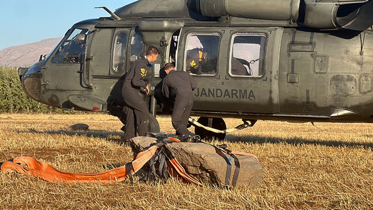 Sabah saatlerinde havalanan askeri helikopter alana ulaşarak halatlar yardımıyla tonlarca ağırlıktaki eserleri alarak Gölyurt köyü Kartal Yaylası kırsalına bıraktı.