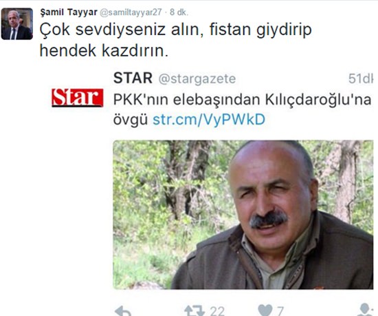 Bunun üzerine AK Parti Gaziantep milletvekili Şamil Tayyar sosyal medya üzerinden "Çok sevdiyseniz alın, fistan giydirip hendek kazdırın." dedi.