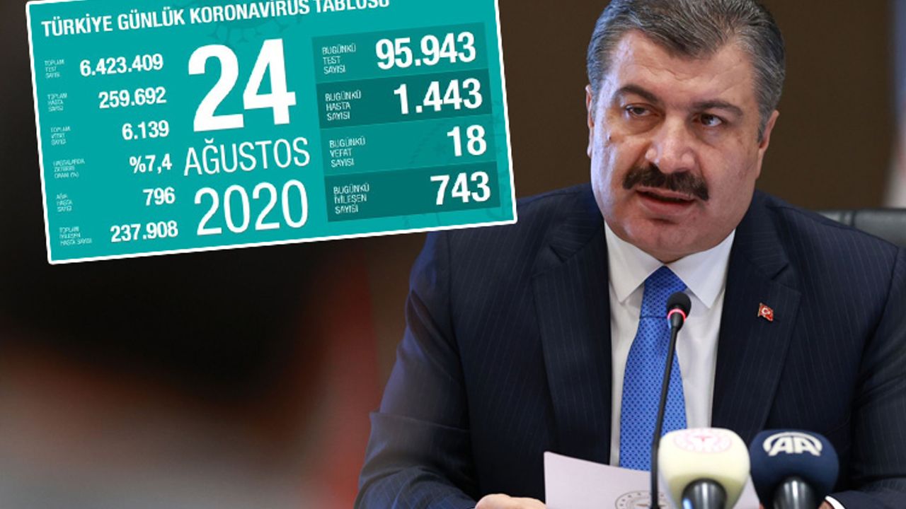 Sağlık Bakanı Fahrettin Koca, "Bugün yapılan yaklaşık 96 bin test sonucu 1.443 yeni hasta tespit edildi. Ağır hasta sayımız 800 civarında. Sağlık çalışanlarımız var gücüyle hastalarımızı iyileştirmeye çalışıyor. Hasta sayımızı düşürecek olan tedbirlerdir. Sonunda yenilen virüs olacak." dedi.