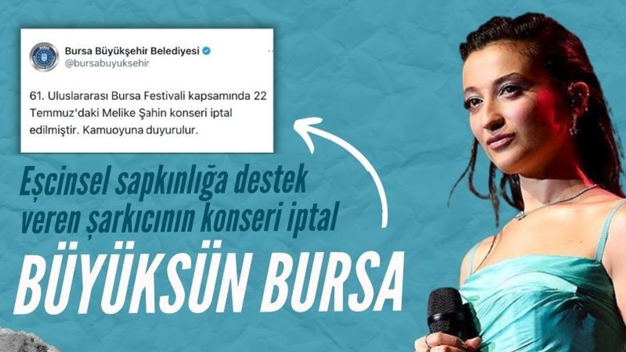 Bursa'da 22 Temmuz Cumartesi günü Kültürpark'ta konser verecek olan şarkıcı Melike Şahin'in konseri iptal edildi.
