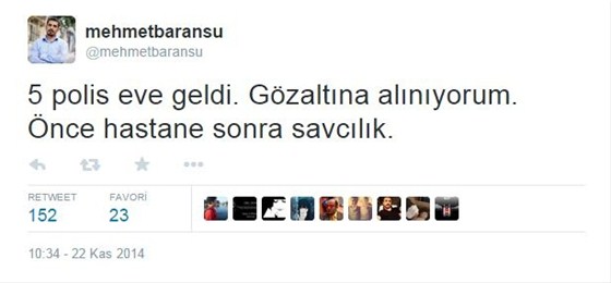 Gazeteci Mehmet Baransu, Twitter hesabından gözaltına alındığını duyurdu. Baransu, "5 polis eve geldi. Gözaltına alınıyorum. Önce hastane sonra savcılık." ifadesini kullandı.
