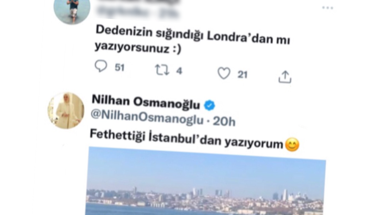 Bir Twitter kullanıcısı, söz konusu gönderinin altına ''Dedenizin sığındığı Londra'dan mı yazıyorsunuz?'' şeklinde yorum yapınca, Osmanoğlu'ndan efsane bir cevap geldi.