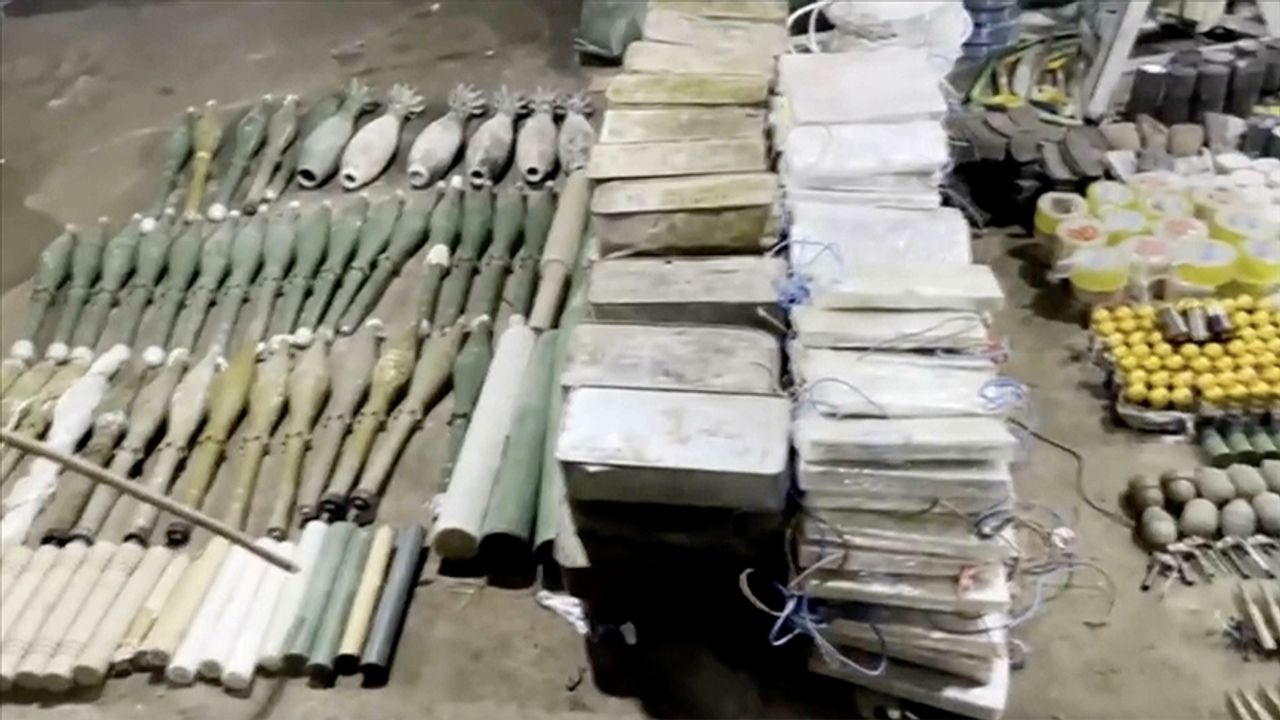 "1 doçka uçaksavar silahı, 40 tuzaklanmış el bombası, 11 taarruz el bombası, 28 el yapımı patlayıcı (EYP), 11 AK-47 piyade tüfeği, 7,62 milimetre PKMS 5 makinalı tüfek, 1 Dragunov keskin nişancı tüfeği, 5 kilogram plastik patlayıcı, 36 RPG-7 roketatar antitank mühimmatı, 5 RPG-7 roketatar antipersonel mühimmatı, 1 RPG-7 roketatar termobarik mühimmatı, 178 EYP basma düzeneği, 120 milimetre 6 havan mühimmatı, 17 bin 625 adet 12,7 milimetre mühimmat, 14 bin 400 adet 7,62 milimetre PKMS makineli tüfek mühimmatı, 135 adet 14,5 milimetre doçka uçaksavar mühimmatı, 66 adet 40 milimetre bomba atar tahrip mühimmatı, 6 adet 40 milimetre bomba atar sis mühimmatı, 5 adet 7,62 milimetre PKMS makineli tüfek yedek namlusu, 10 Dragunov keskin nişancı tüfeği şarjörü, 50 AK-47 piyade tüfeği şarjörü, 10 taarruz el bombası fünyesi, 28 adet RPG-7 roketatar sevk fişeği, bir motorlu doçka uçaksavar sehpası, 100 metre saniyeli fitil, 200 metre infilaklı fitil, çeşitli renklerde 27 sis, 2 bin 350 metre elektrik kablosu, 300 metre uydu kablosu, 4 el testeresi, 2 elektrikli ve 2 benzinli hilti, 70 hilti ucu, 3 benzinli hızar, 5 analog telefon, örgütsel doküman, 3 gaz maskesi ve filtresi, 8 akü, 5 jeneratör, 20 oksijen tüpü, 15 kutu havai fişek, bir televizyon ve çanak anten, bir adet 5 ton kapasiteli su tankı ve çok sayıda muhtelif yaşam malzemesi."