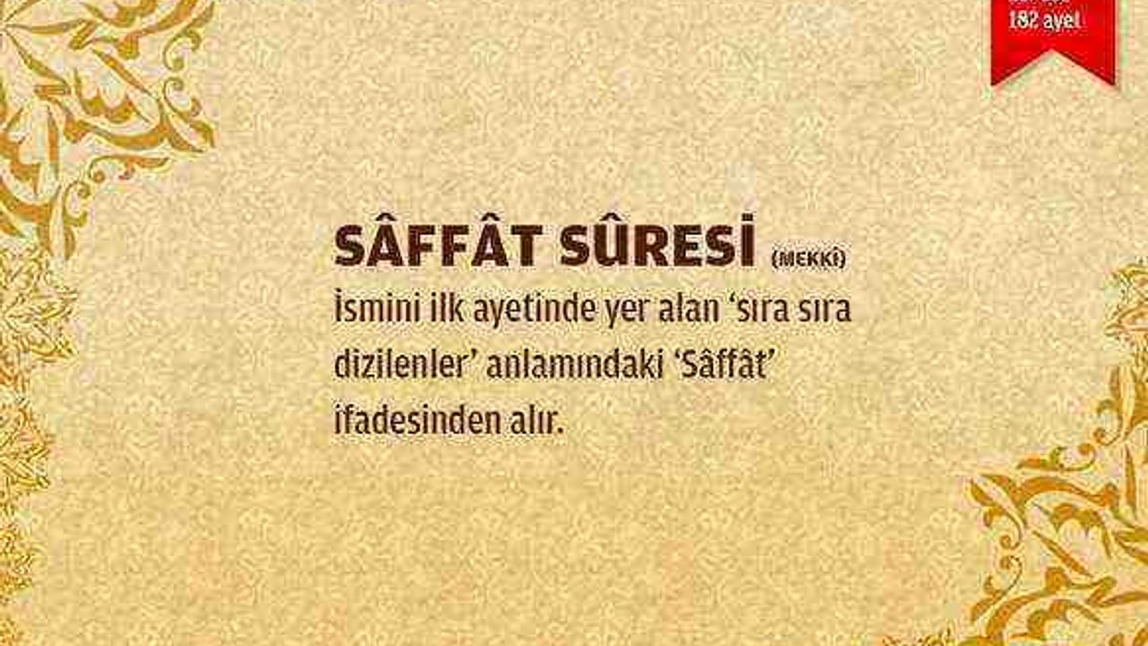 Saffat sûresinde Allah'ın birliği, ahiret hayatının gerçekliği, o hayatta neler olacağı, inkarcıların ahiretteki pişmanlıkları ve birbirlerini suçlamaları. Kuran-ı Kerimin 37. suresi olan Saffat Suresi 182 ayet olarak indirilmiştir. Saffat Suresinin nazil olduğu yer olarak Mekke bilinir. Sure ismini ilk ayetinden alır. 'Saffat' kelimesi 'sıra sıra duranlar' anlamına gelmektedir. Göklerin, yerin ve bunlar arasında bulunanların rabbi tek Allah'tır. Yüce Allah'ın varlığını,birliğini ve kudretini anlatan bir suredir. Saffat suresinin okunuşu ve anlamı? Surenin nerede ve ne zaman indirildiği? Bu soruların cevapları haberimizde. Detaylar için haberimizi okuyabilirsiniz.