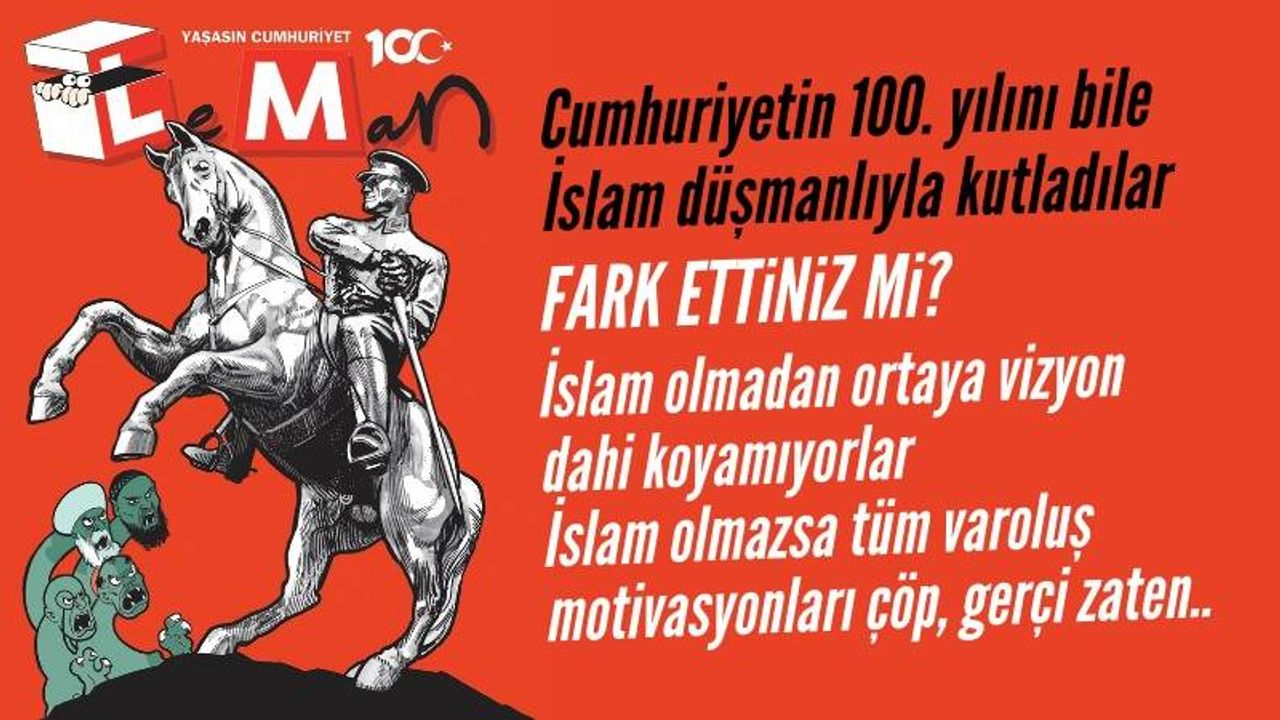 Başkan Erdoğan'ın başlattığı milli teknoloji hamlesi ile birlikte Türkiye yeni bir 100. yıla girerken tek bildikleri Müslümanlara yobaz diyerek, şuursuzca diktikleri heykellerle övünmek olan sol zihniyet yine sahneye çıktı. Terör suçundan hapiste yatan Selahattin Demirtaş'a sayfalarında karikatür çizdiren Leman, yine Türkiye'yi bölmek için uğraşan Osman Kavala gibi isimlere özgürlük isteyen Leman, kendi karanlık dünyalarını paylaşmıyor diye Cumhuriyet'in 100.yılında ülkesinin kalkınması için yoğun mesai harcayan müslümanları hedef aldı.