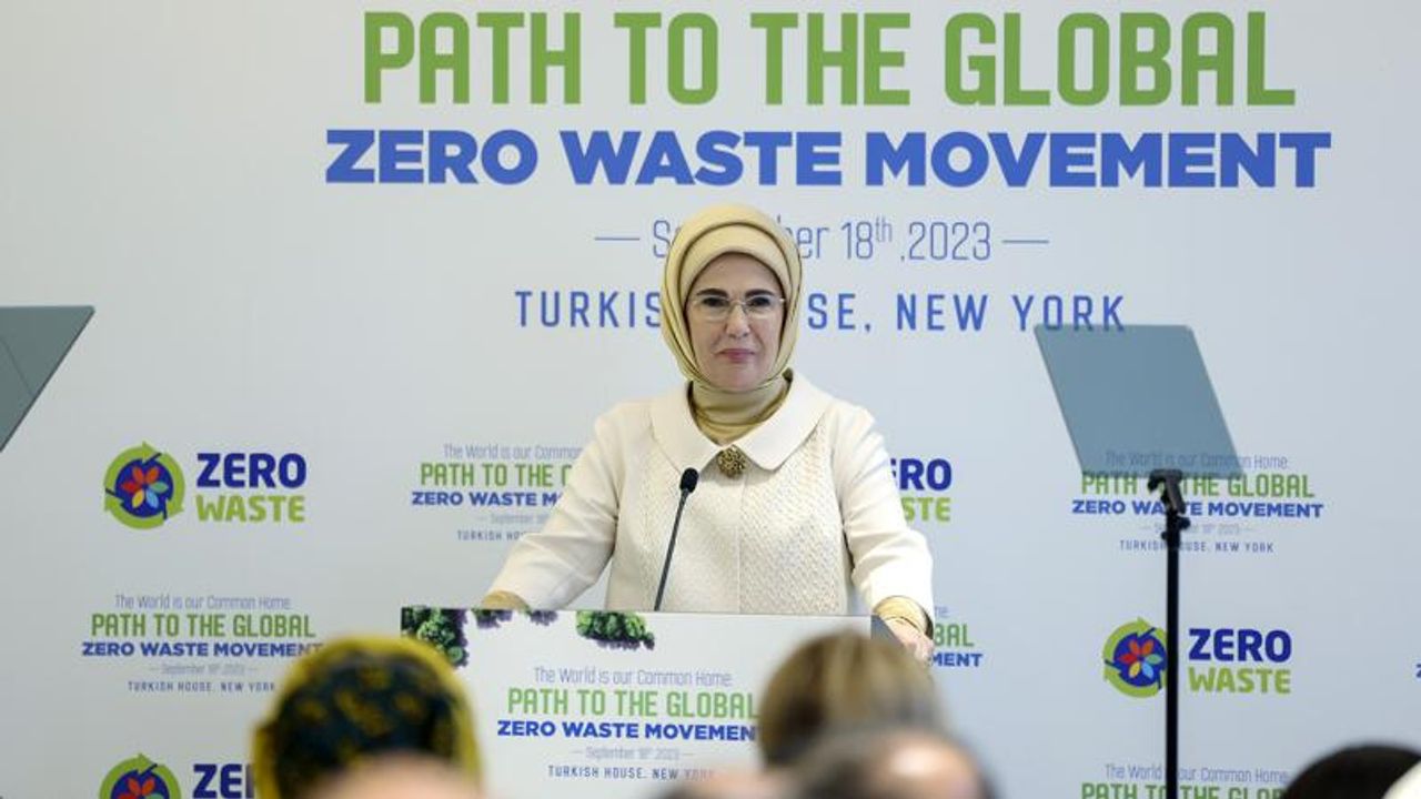 Emine Erdoğan, Türkevi'nde, devlet başkanı eşleri, BM'nin üst düzey yöneticileri, diğer ülke diplomatları ve New York Belediye Başkanı Eric Adams'ın hazır bulunduğu programda, "Küresel Sıfır Atık Hareketine Doğru" isimli etkinlikte konuştu.
