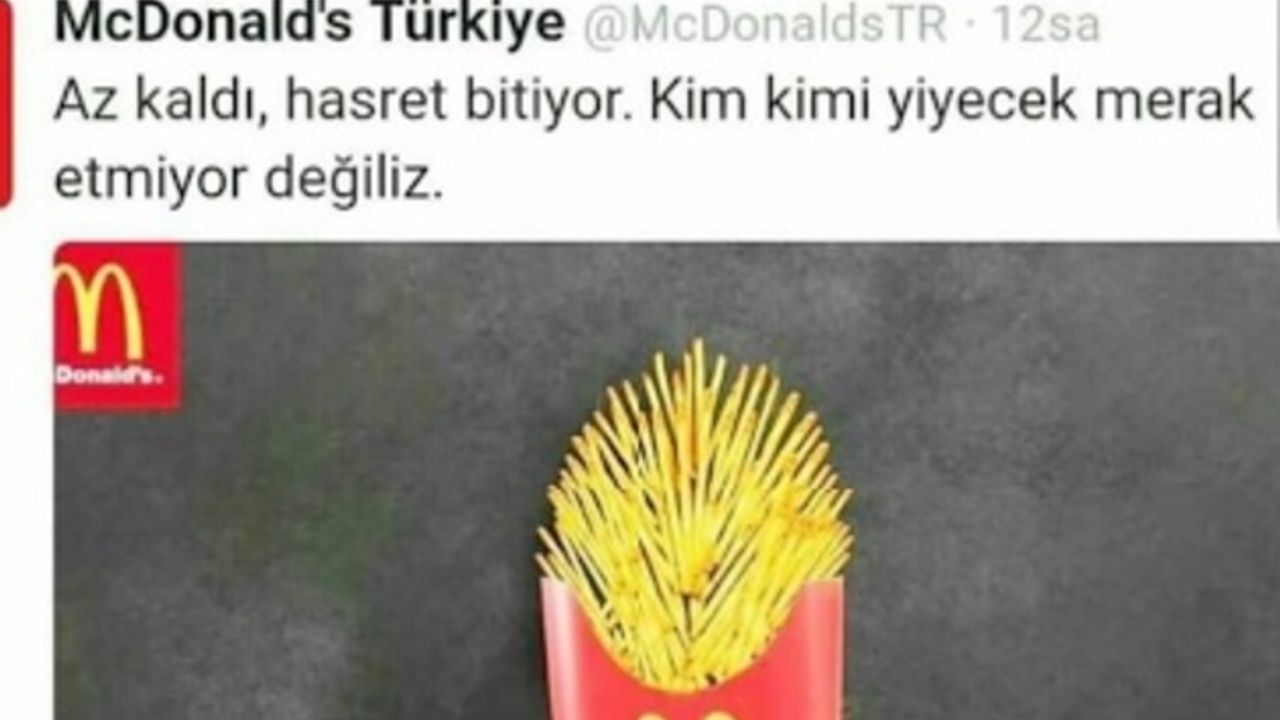 Ülker'in 1 Nisan reklamındaki darbe çağrışımı yapan garip mesajlarının yarattığı tartışmalar henüz sıcaklığını korurken, benzer bir paylaşım da ünlü hamburgerci Mc Donalds'ın Türkiye hesabından yapıldı. Üstelik bu paylaşımda çok açık bir tehdit var; hamburger devinin reklam görselindeki mesajda, 'Az kaldı hasret bitiyor; kim kimi yiyecek merak etmiyor değiliz' denildi.