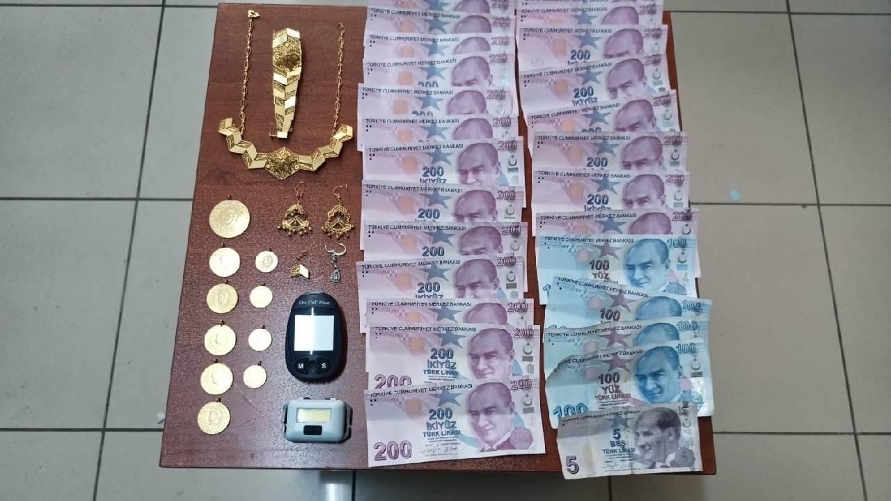Şahıslardan B.N.Y.’nin üzerinde 5 adet tam altın, 4 adet yarım altın, 1 adet gremse altın, 1 çift altın küpe, 1 adet gümüş küpe, 1 adet altın küpe, 1 adet altın kolye, 1 adet altın bileklik, 4 bin 605 TL para ele geçirildi.