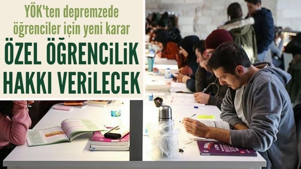 Yükseköğretim Kurulu (YÖK) 6 Şubat'taki Kahramanmaraş merkezli depremlerden etkilenen Adıyaman, Hatay, Kahramanmaraş ve Malatya'daki üniversitelerde öğrenim gören öğrencilere, talepleri halinde kayıtlı oldukları programla eşdeğer ve öğretim dili aynı olan diğer devlet üniversitelerindeki programlarda özel öğrencilik hakkı verilmesini kararlaştırdı.