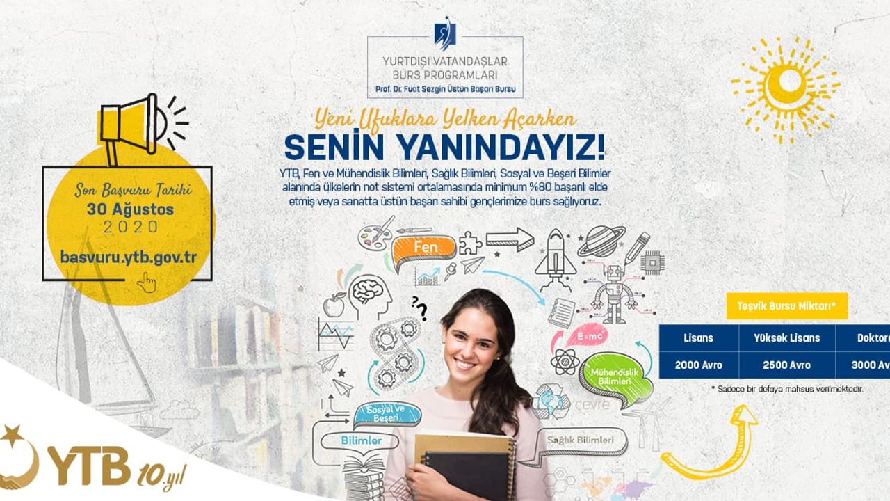 "Fuat Sezgin Üstün Başarı Bursu"na başvurular; 30 Ağustos 2020 tarihinde son bulacak olup https://basvuru.ytb.gov.tr/ internet adresinden alınacak.