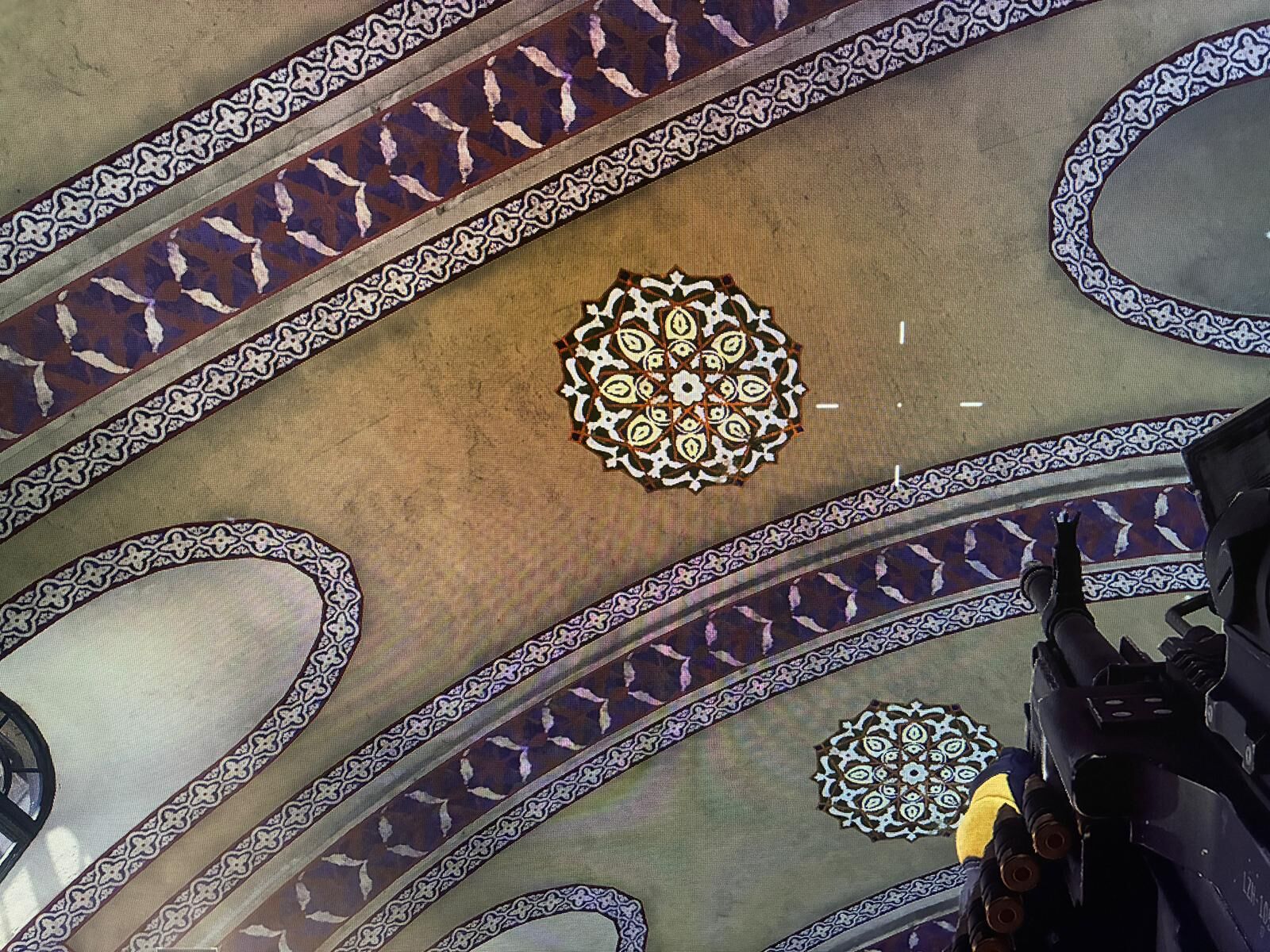 2. ve 4. görsel — Osmanlı/İslam mimarisine özgü kemerli tavan, şemse motifleri, çini desenleri → Kapalıçarşı'nın ana koridoru