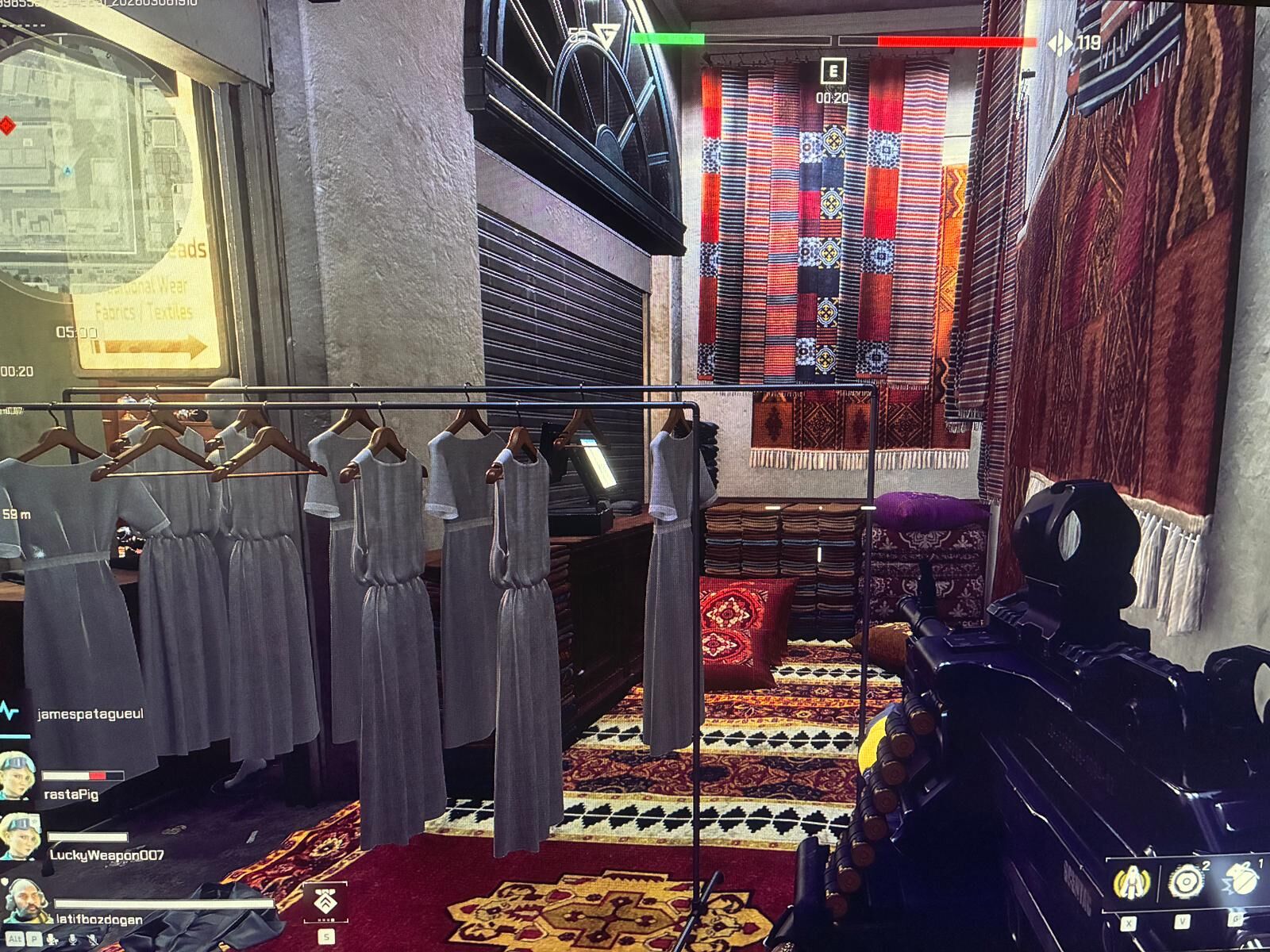 1. görsel — El dokuması halılar, askılık elbiseler, "Fabrics/Textiles" yazısı → Kapalıçarşı'nın kumaş çarşısı bölümü