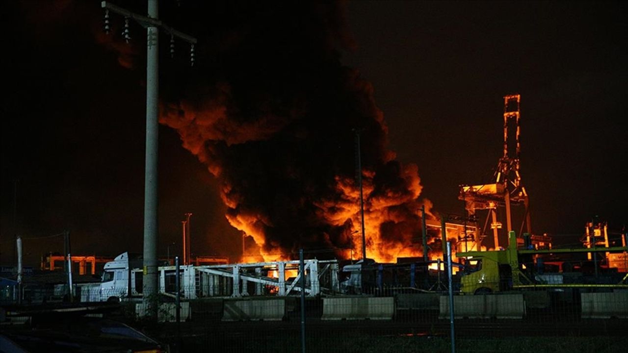 Kahramanmaraş merkezli ve 10 ili etkileyen depremler sırasında dün henüz belirlenemeyen nedenle konteynerlerde çıkan yangın gece boyunca devam etti.