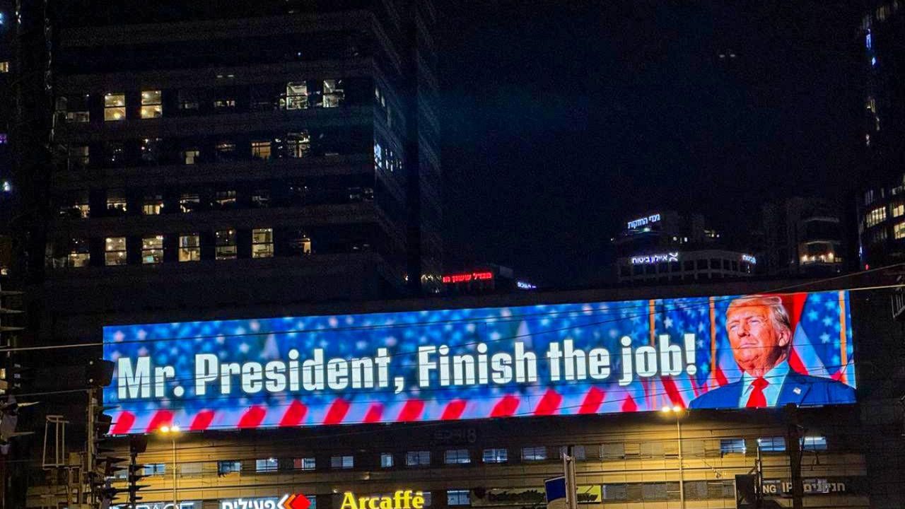 İsrail'in, Washington'a yaptığı siyasi ve diplomatik çağrılarının yanı sıra kamuoyu kampanyası da dikkati çekiyor. Bu kapsamda, Tel Aviv'de bir otoyol üzerindeki binaya "Bay Başkan, işi bitir" yazılı, Trump'ın resminin ve ABD bayrağının yer aldığı bir pankart asıldı.