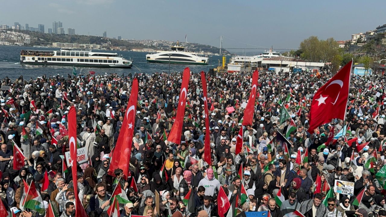 İsrail'in 7 Ekim 2023'ten bu yana Filistin'in Gazze Şeridi'ne yönelik gerçekleştirdiği, binlerce kişinin hayatını kaybettiği saldırılara dikkati çekmek için Fıstıkağacı Metro İstasyonu önünde toplanan çok sayıda kişi, Üsküdar Meydanı'na yürüdü.