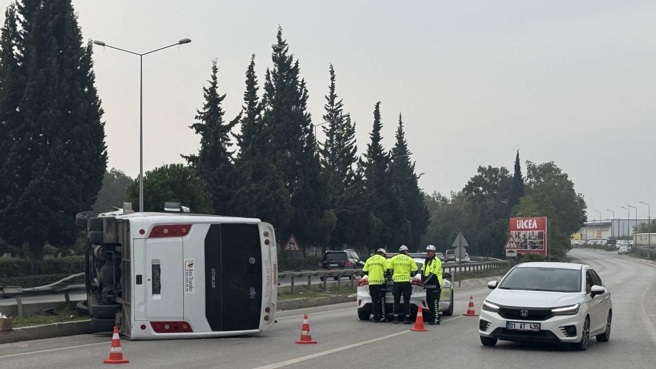 H.B. (57) idaresindeki, İzmir Adnan Menderes Havalimanı personelini taşıyan plakası henüz öğrenilemeyen midibüs, Menderes Caddesi'nde refüje çarpıp devrildi.