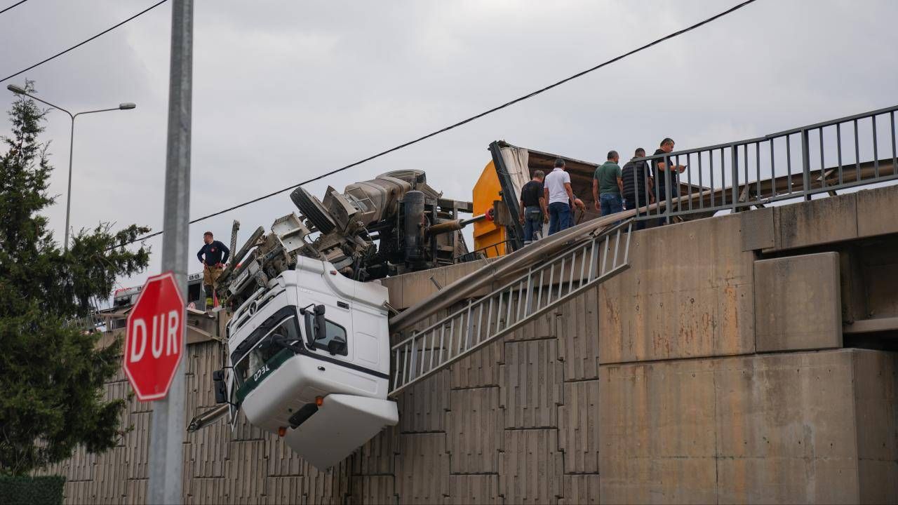 İ.Ö. idaresindeki tır, Ankara Caddesi 4. Sanayi Kavşağı'nda seyir halindeyken sürücüsünün kontrolünü kaybetmesi sonucu devrildi. Sürüklenen tır, viyadükte asılı kaldı.