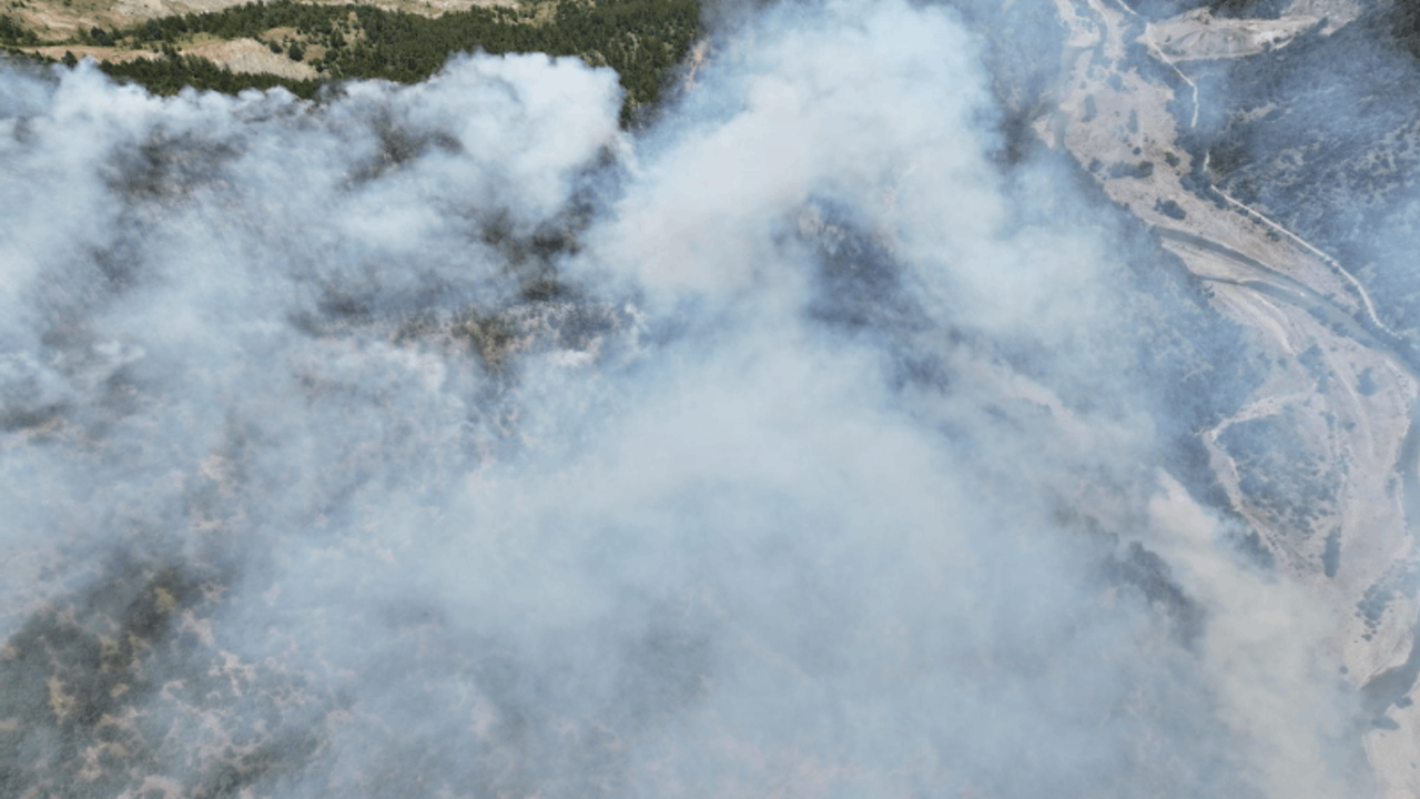Havadan müdahalede zorlukların yaşandığına işaret edilen açıklamada, ekiplerin yangın söndürme çalışmalarının hızla devam ettiği kaydedildi.