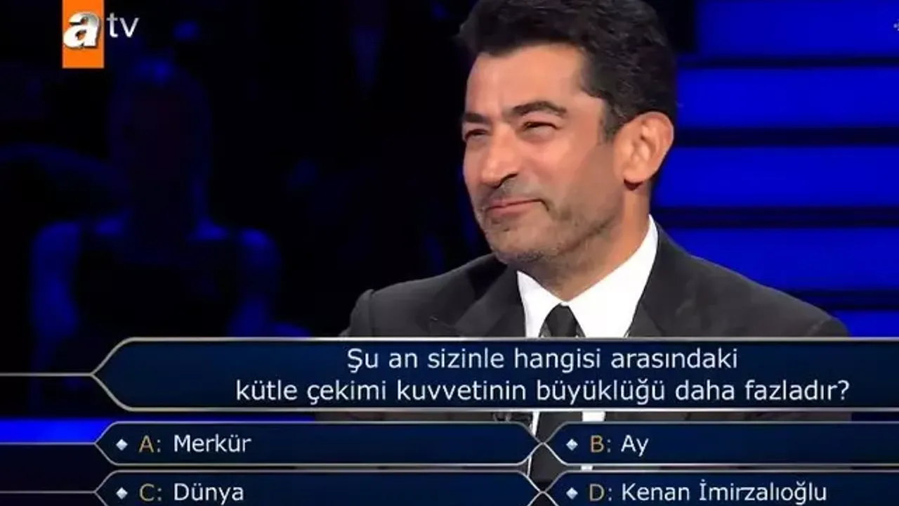 Kim Milyoner Olmak İster'de yarışmacıya sorulan bir sorunun şıkkında adını gören sunucu Kenan İmirzalıoğlu kahkahaya boğuldu.ATV'nin reyting rekortmeni yarışma programı, izleyicileri ekran başından ayırmamaya devam ediyor.