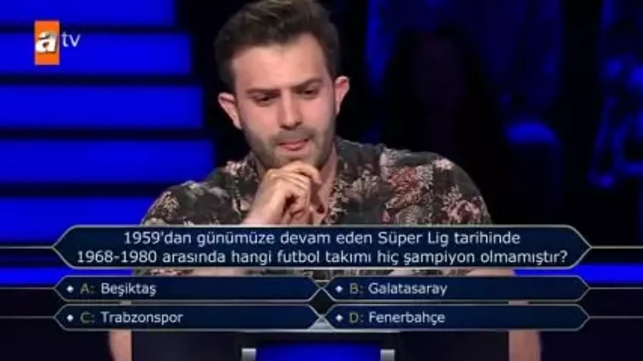 Kim Milyoner Olmak İster'de geceye damga vuran soru sosyal medyada gündem oldu. 200 Bin TL'lik, ''1959'dan günümüze devam eden Süper Lig tarihinde 1968-1980 arasında hangi futbol takımı hiç şampiyon olmamıştır?'' sorusuna yarışmacı yanlış cevap verdi.