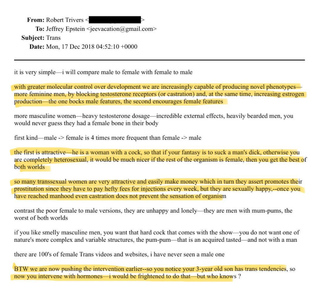 Jeffrey Epstein’ın, 2018 yılında Rutgers Üniversitesi’nde görev yapan Amerikalı evrimsel biyolog Robert Trivers ile yaptığı e-posta yazışmalarının ortaya çıktığı öne sürüldü. İddialara göre yazışmalarda, ilaçlar ve biyolojik müdahaleler yoluyla cinsiyet değişimi gibi son derece tartışmalı konular ele alındı.