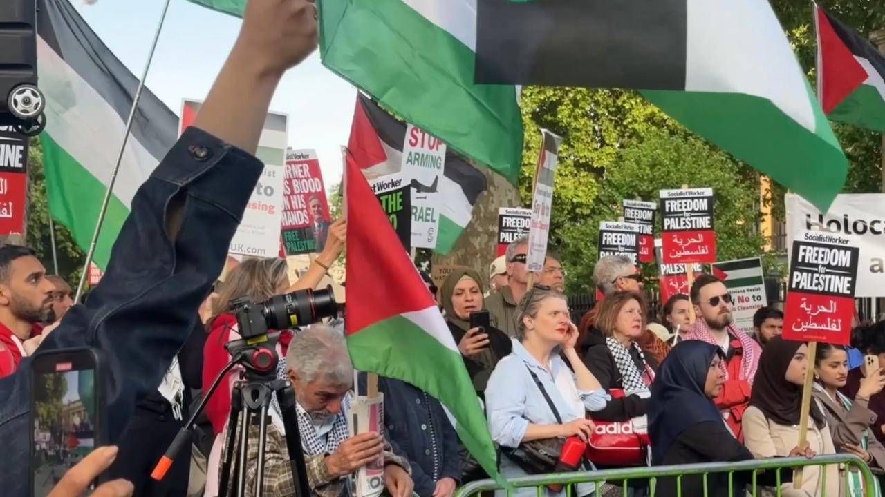 Londra'nın ünlü parklarından Green Park girişinde toplanan on binlerce eylemci, Filistin'e destek için Başbakanlık Ofisi 10 Numara'nın bulunduğu Downing Sokağı girişine yürüdü.