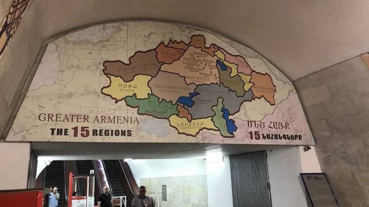 Erivan metrosunun girişindeki sözde büyük Ermenistan haritası, Doğu Anadolu, Güneydoğu ve Karadeniz’in bir kısmı, Nahçıvan, Azerbaycan ve Hazar denizi Ermenistan toprağı olarak gösteriliyor.